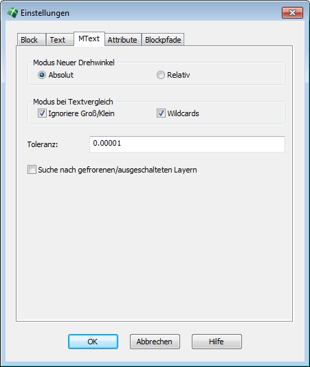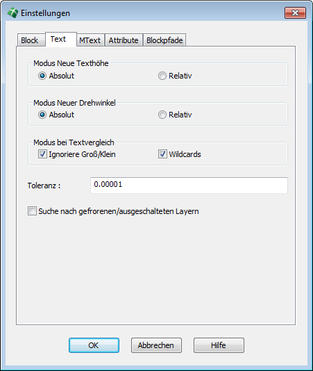 - Suche auch in ausgeschalteten/gefrorenen Layern - Mit diesem Schalter können Sie bestimmen, ob Textelemente auch auf gefrorenen/ausgeschalteten Layern gesucht, gefunden und verwendet werden sollen.
