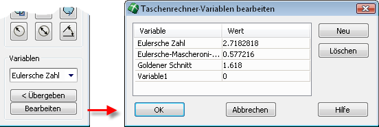 An die Eingabezeile lassen sich feste Zahlenwerte als Variablen übergeben. Die Werte können aus einer Klappliste gewählt und durch Betätigung der Schaltfläche <Übergeben an die Eingabezeile übertragen werden. |