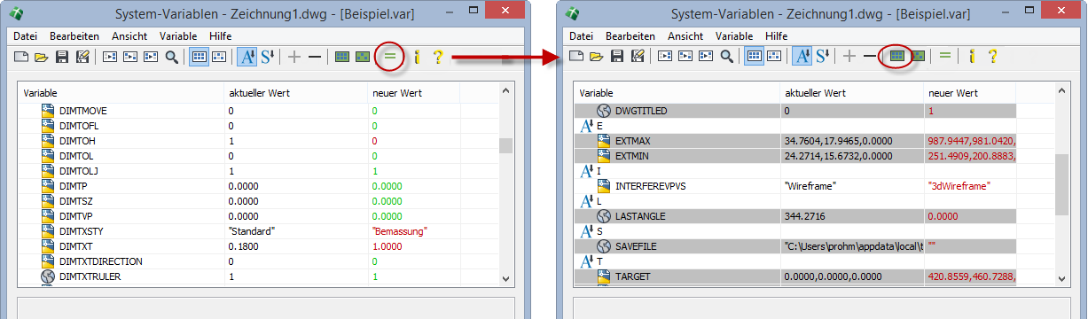 Mit Hilfe des Icons Vergleichen lassen sich alle Variablenwerte mit den aktuellen Werten vergleichen. Das grüne Gleichheitszeichen ändert seine Farbe nach rot und es werden nur noch alle abweichenden Werte dargestellt.
