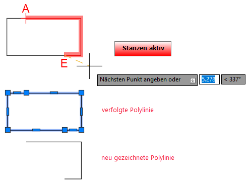 Die Polylinienverfolgung bietet einen speziellen Stanzmodus, welcher über die Optionen stanzenEin bzw. stanzenAus im laufenden Befehl beliebig aktiviert bzw. deaktiviert werden kann. Ein aktivierter Stanzmodus wird durch eine rote Markierung in der Nähe des Cursors angezeigt und bewirkt, dass jeder entlang einer vorhandenen Kontur gezeigte Punkt als Stützpunkt in diese geprägt wird. Der Verfolgungsmodus muss dafür nicht zwingend angewendet werden.