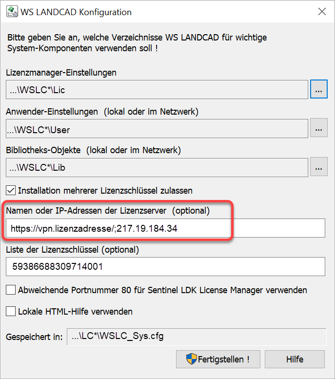 Die Angabe von Lizenzservern oder expliziter Lizenzschlüssel ist stets optional und unabhängig voneinander. Sie ist daher jederzeit auch nach der Installation von WS LANDCAD möglich. Mehrere Einträge müssen jeweils durch ein Semikolon (;) voneinander getrennt werden.