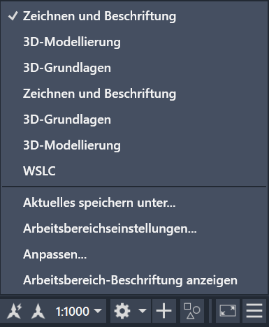 Zur Wahl des Arbeitsbereiches klicken Sie bitte auf die Schaltfläche Arbeitsbereich wechseln, die sich am rechten unteren Rand der Statuszeile oder auch im Schnellzugriff-Werkzeugkasten des CAD-Programmfensters befindet. Je nach eingesetzter CAD-Version erscheint nun eine Liste mit allen in WS LANDCAD verfügbaren Arbeitsbereichen. Diese gliedert sich stets in diejenigen Arbeitsbereiche, die aus der jeweiligen CAD-Version stammen, unter denen WS LANDCAD läuft und den WS LANDCAD-Arbeitsbereichen, die Sie mit Hilfe des Startmanagers erstellt haben und an dem Suffix _WSLC + Versionsnummer erkennen. Arbeitsbereiche aus AutoCAD oder BricsCAD enthalten stets nur die Bedienelemente, die im CAD-System definiert sind. WS LANDCAD-Arbeitsbereiche enthalten zusätzlich die Bedienelemente von WS LANDCAD, welche immer an das Ende der CAD-Bedienelemente angehängt werden. |