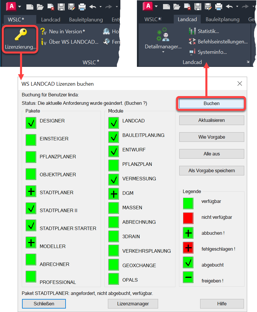 Nach einer Erstinstallation werden automatisch alle verfügbaren Module abgebucht und erscheinen daher in der Programmoberfläche. Um nur diejenigen Module abzubuchen, die Sie tatsächlich benötigen, rufen Sie bitte den Befehl Lizenzierung auf, worauf der DialogWS LANDCAD Lizenzen buchen erscheint. Sie können nun die benötigten Pakete und/oder Module in den Kästchen aktivieren und anschließend die Schaltfläche Buchen betätigen, worauf die Markierungen durch Häkchen bestätigt werden. Nachdem Sie den Buchungsdialog mit Schließen verlassen, wird das Menüsystem gemäß der Auswahl neu initialisiert.