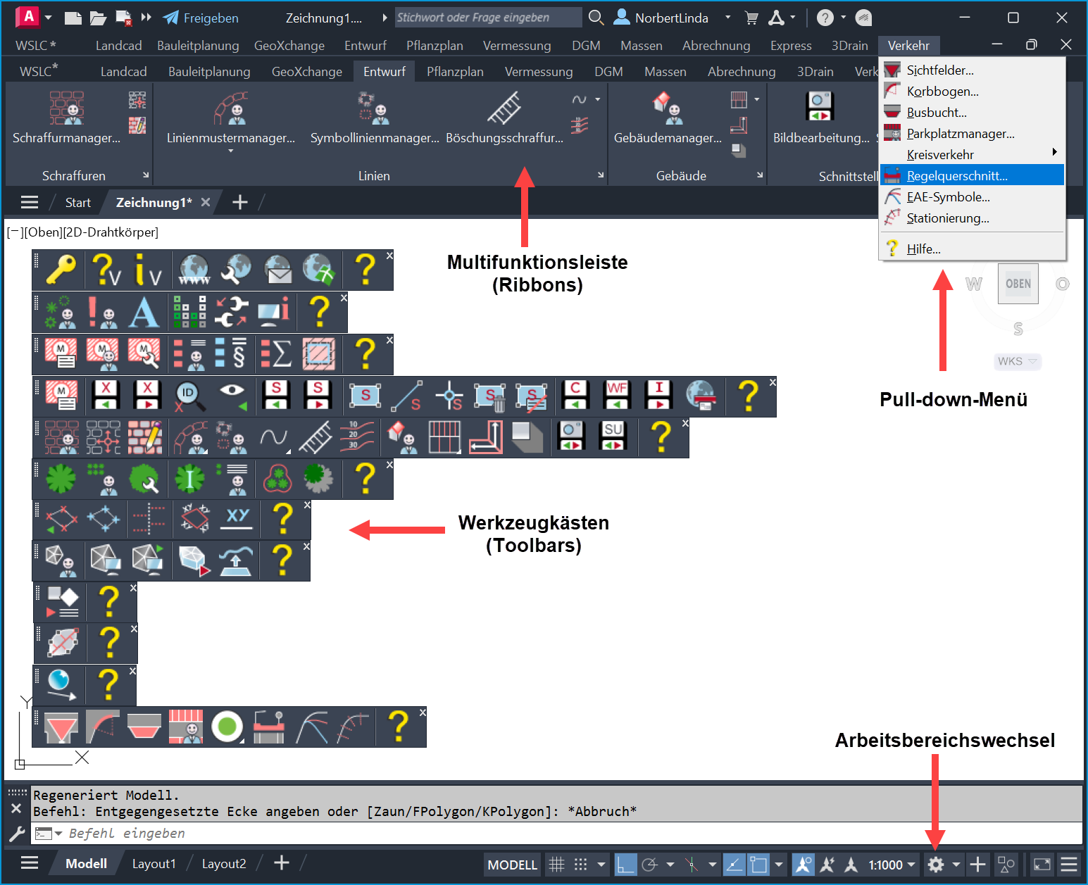 Als Bedienelemente eines WS LANDCAD-Profils sind je nach verwendeter CAD-Version entsprechende Pull-down-Menüs, Werkzeugkästen sowie Multifunktionsleisten-Registerkarten (Ribbons) mit einer oder mehreren Gruppe(n). Diese sind jeweils für zentrale Grundfunktionen, sowie jedes weitere verfügbare WS LANDCAD-Modul vorhanden.