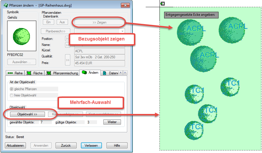 Unabhängig davon können Sie nun die Objektwahl vornehmen, wenn Sie mehr als eine Pflanze ändern möchten. Für die Objektwahl können Sie alle gängigen Auswahlmethoden verwenden, wobei das Programm alle gültigen Objekte im Sinne der Pflanzplanung herausfiltert.