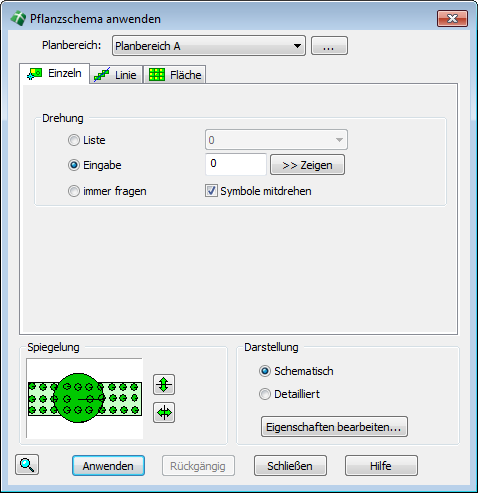 Im mittleren Dialogbereich wird die Art der Anwendung über drei Reiterschalter festgelegt. Pflanzschemata können Einzeln, entlang einer Linie oder in einer Fläche angewendet werden. Die Optionen wechseln jeweils nach der selektieren Pflanzart. Im unteren Dialogbereich wird das gewählte Schema schematisch dargestellt, wobei es jeweils nach zwei Achsen gespiegelt werden kann.