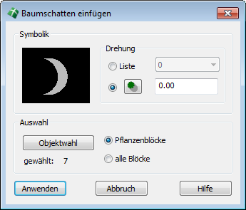 Wenn Sie in das Grafikfenster (Symbolik) der Dialogbox klicken, können Sie ein entsprechendes Symbol auswählen, wobei i. d. R. das zuletzt verwendete Symbol als Vorgabe erscheint. Die Drehung des Schattensymbols können Sie aus einer Liste wählen, in das Eingabefeld eintragen oder durch Zeigen am Bildschirm graphisch bestimmen. Die Liste liegt als einfache ASCII-Dateien PFLWINKEL.INI im Programmverzeichnis der Pflanzplanung vor und kann von Ihnen editiert werden.