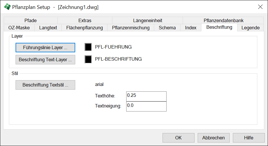 Die Beschriftung von Pflanzen wird mit Hilfe des Legenden- und Beschriftungsmanagers durchgeführt. Das Setup regelt hierbei die Vorgabelayer für die generierten Elemente (Führungslinie und Beschriftungstext) sowie den Textstil der Beschriftung, dessen Parameter unabhängig von AutoCAD eingestellt werden können.