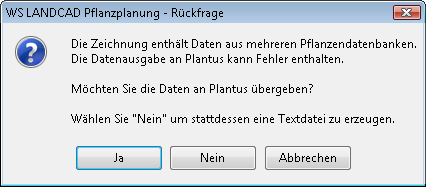 Sollte die aktuelle Zeichnung Pflanzdaten aus unterschiedlichen Datenbanken beinhalten, wird dies vom Programm erkannt und mit einer entsprechenden Warnmeldung quittiert. Sie haben dann die Möglichkeit ein Text-LV erstellen zu lassen, welches in jedem Fall korrekte Daten beinhaltet.