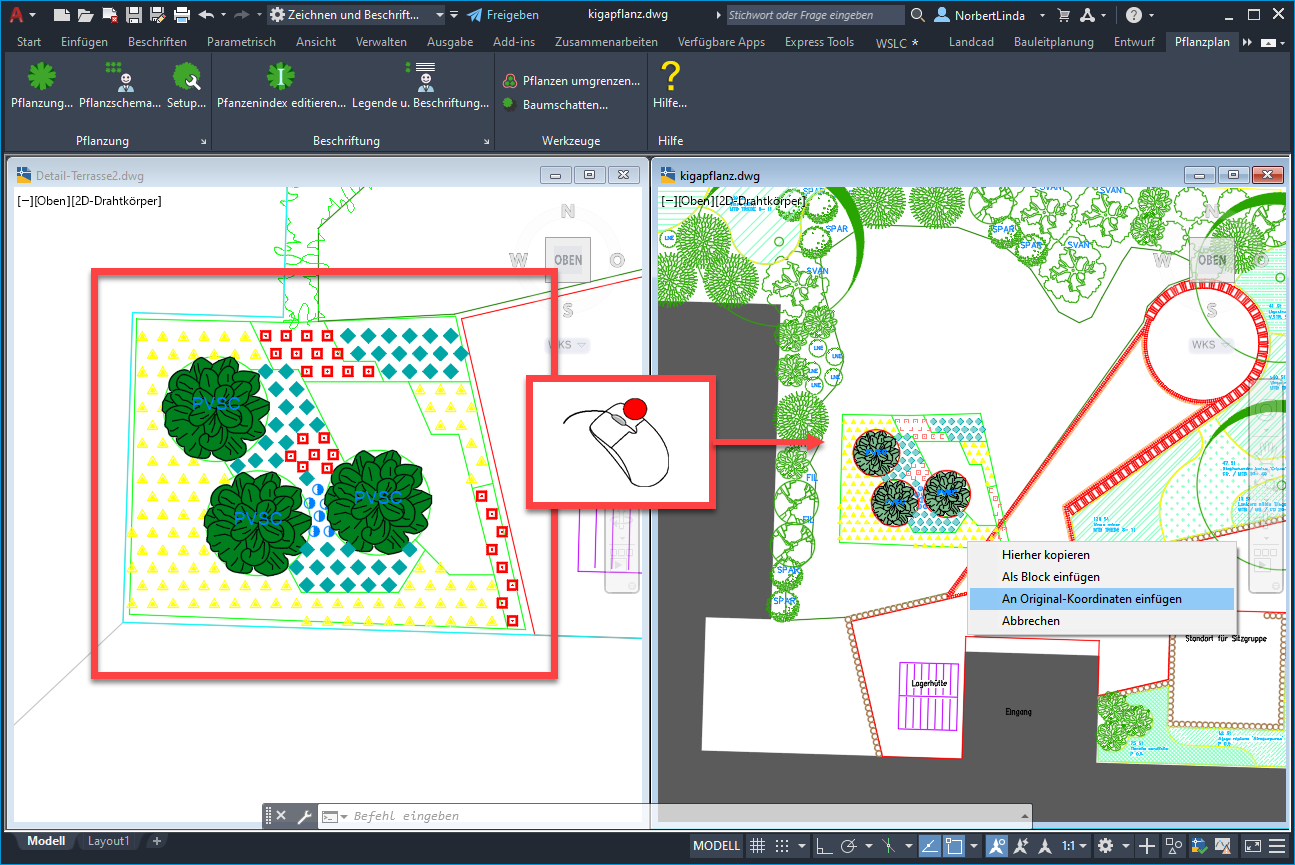 Pflanzungen werden am einfachsten per Drag & Drop von einer in die andere Zeichnung kopiert. Hierbei können sowohl Einzel- als auch Flächenpflanzungen herangezogen werden. Öffnen Sie hierzu einfach beide Zeichnungen und stellen Sie die Fenster am besten nebeneinander, damit beide Zeichnungen sichtbar sind. Stellen Sie danach günstige Zoom-Ausschnitte für die Zeichnungen her, damit Sie den Ursprung und das Ziel bestmöglich sehen und wählen können.