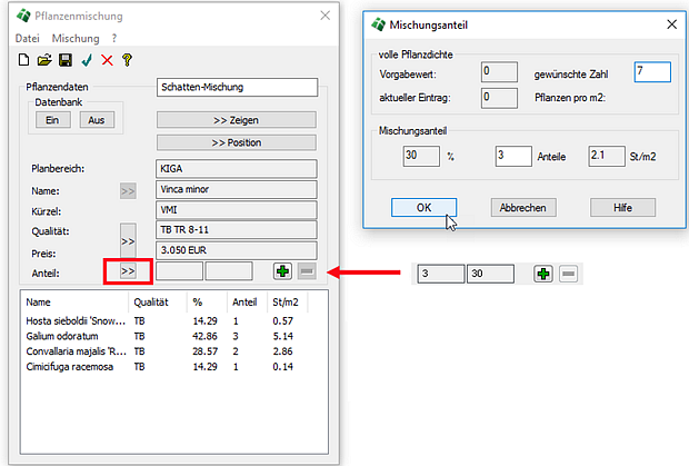 Der Mischungsanteil einer bestehenden Pflanze lässt sich jederzeit ändern, indem die Pflanze in der Liste markiert und der Dialog Mischungsanteil erneut aufgerufen wird. Bitte beachte Sie, dass sich dadurch die Verhältnisse der anderen Pflanzen ebenfalls automatisch ändern, da eine Pflanzenmischung stets 100 % Pflanzen enthält.