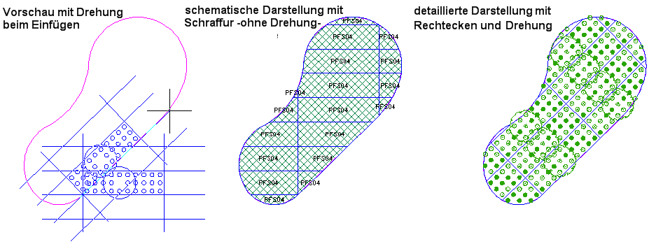 Bei der flächenhaften Anwendung kann eine Umgrenzung automatisch mit einem Pflanzschema gefüllt werden. In den Optionen kann zunächst wie bei der Einzelanwendung die Eingabe einer Drehung für das Schema-Rechteck festgelegt werden. Durch die Auswahl aus der Liste oder einer Winkeleingabe wird die Drehung der Schemata festgelegt. Bei der Option immer fragen, kann die Drehung während des Einfügevorgangs separat vorgenommen werden.