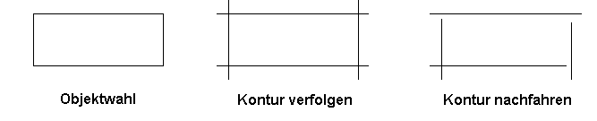 • Kontur verfolgen - Diese Auswahloption erfordert die Auswahl von Begrenzungselementen das einmalige Picken in die eingeschlossene Fläche. Daraufhin wird eine geschlossene Polylinie erzeugt, die in die Objektwahl und somit als eigentliche Flächenbegrenzung aufgenommen wird. Verwenden Sie diese Auswahloption also dann, wenn zwar keine geschlossenen Polylinien, jedoch geschlossene Konturen vorliegen (analog zum Schraffurbefehl).