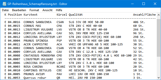 Die zu den Schemata gehörigen Pflanzen können, wie in der rechten Dialogseite dargestellt, als Pflanzliste in einer Textdatei gespeichert werden. Die Textliste kann auf vielseitige Art und Weise z. B. in LVs, Textlegenden u. ä. weiterverwendet werden.