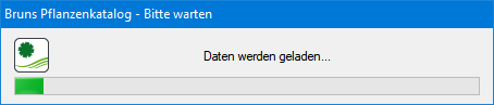 Der BRUNS-Pflanzenkatalog wird automatisch geladen, sobald Sie ihn im Setup unter dem Register Datenbank auswählen oder den Pflanzungsbefehl erstmalig aufrufen und der BRUNS-Pflanzenkatalog von vornherein als aktuelle Datenbank eingestellt ist. Da eine Access-Datenbank verwendet wird, kann dies je nach Rechnertyp einige Sekunden dauern, was durch einen Fortschrittsbalken angezeigt wird. Anschließend wird das Hauptfenster geöffnet.
