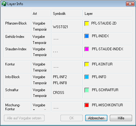 Den aktuellen Status der Layerzuweisung können Sie objektbezogen über die Funktion Layer Info abrufen. Der Befehlsaufruf erfolgt hierbei über das Kontextmenü im oberen Bereich des Pflanzungs-Dialoges oder der Positionsliste. Die Funktion listet sowohl die Vorgabelayer des gewählten Objekts und der Vorgabelayer im Setup als auch eventuell verwendete, temporäre Layer auf. Temporäre Layer können wieder auf die Vorgabe zurückgesetzt werden, wenn Sie die diesbezügliche Schaltfläche betätigen. |