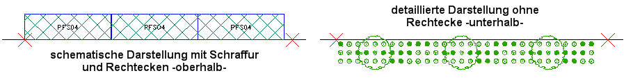 Wie bei der Einzelanwendung, können auch hier die Symbole mit der Ausrichtung des Schema-Rechteckes mitgedreht werden, wenn der entsprechende Schalter aktiviert ist. Eine Vorschau findet bei der Linienhaften Anwendung nicht statt. Die Schemata werden durch Betätigung der Schaltfläche Anwenden direkt an die Führungslinie gezeichnet. Die Anzahl der Schemata ist immer ganzzahlig, d. h. ein Schema wird nicht abgeschnitten.