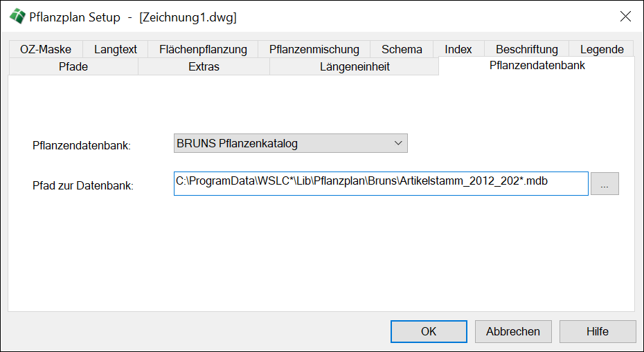 Die Pflanzplanung ist in der Lage, sowohl mit dem integrierten BRUNS-Pflanzenkatalog als auch mit der leistungsfähigeren, externen Pflanzendatenbank Plantus zusammenzuarbeiten. Die Auswahl kann im Listenfeld Pflanzendatenbank getroffen werden. Wird Plantus gewählt, muss sichergestellt sein, dass Plantus installiert und als OLE-Server registriert ist. Bei der Auswahl des BRUNS-Pflanzenkatalogs wird ein weiteres Feld eingeblendet, in welchem die zu verwendende Datenbank auszuwählen ist. Die Vorgabe ist der originale Artikelstamm, welcher sich im Bibliotheksverzeichnis der Pflanzplanung im Verzeichnis \Lib\Pflanzplan\\Bruns befindet. Es lassen sich jedoch auch beliebige andere Datenbanken verwenden, die Sie mit Hilfe des BRUNS-Pflanzenkatalogs erstellt haben.