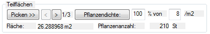 Durch die Pflanzendichte wird die Stückzahl einer Teilfläche festgelegt, welche weiterhin von der Flächengröße und dem Füllungsgrad abhängig ist. Die Pflanzendichte wird stets in Stück/m2 angegeben und kann jederzeit verändert werden. Ist nach der Auswahl einer Pflanze kein Vorgabewert in der Datenbank enthalten, öffnet sich eine kleine Dialogbox, in welcher Sie die Pflanzendichte eintragen müssen. Dieser Dialog ist auch in der Ausgestaltungsphase durch Betätigung der Schaltfläche Pflanzendichte verfügbar und zeigt den aktuellen Eintrag sowie etwaige Vorgabewerte der Datenbank an. |