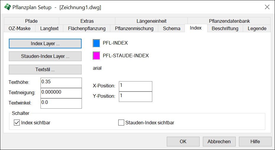 Der Pflanzenindex oder auch Kürzel dient vor allem bei technisch ausgerichteten Pflanzplänen zur Identifikation des Pflanzennamens. Er wird für Gehölze und Stauden separat verwaltet und besteht aus einem Attributtext, der relativ zum Blockeinfügepunkt zusätzlich im Pflanzensymbol erscheint.