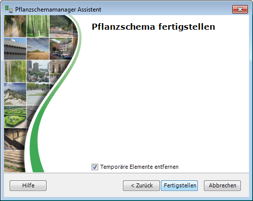 Im letzten Schritt müssen Sie das Pflanzschema fertig stellen. Über die entsprechende Schaltfläche wird das Schema endgültig erstellt und der Assistent geschlossen. Während der Erstellung des Pflanzschemas erstellt das Programm temporäre Elemente. Es wird empfohlen diese nach der Fertigstellung zu löschen. Hierfür lassen Sie einfach das Häkchen bei Temporäre Elemente entfernen gesetzt. |