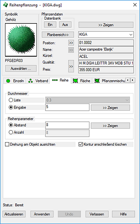 Die Reihenpflanzung verteilt Einzelpflanzen nach vorgegebenem Abstand oder Anzahl entlang einer beliebigen Polylinie und stellt damit genau wie die Verbandspflanzung eine automatisierte Einzelpflanzung dar. Sie wird vorzugsweise für Allee- oder Heckenpflanzungen verwendet.