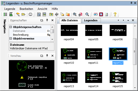 Reportstile sind spezielle ASCII-Dateien in denen ein Stil für die Pflanzenbeschriftung oder die Pflanzenlegende definiert ist. WS LANDCAD bietet diverse Reportstile im Verzeichnis \LIB\PFLANZPLAN\REPORT, welches automatisch als Favoriten Beschriftung und Legende installiert werden. Alle Stile können sowohl für Legenden als auch für Beschriftungen verwendet werden. Sie können diese Stile mit Hilfe des Legenden- und Beschriftungsmanagers beliebig ändern oder erweitern. |