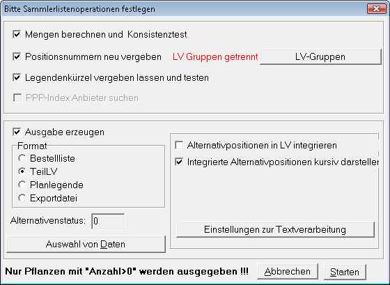 • Positionsnummern neu vergeben – Diese Funktion nummeriert das LV gemäß der Startposition in den Einstellungen zur Sammlerliste neu durch. Haben Sie LV-Gruppen aktiviert, wird das LV nach den Positionsnummern der jeweiligen Gruppen (Stauden, Gehölze, Gräser, Bodendecker, usw.) gegliedert.