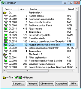 Die Positionsliste ist die zentrale Übersicht über alle in der Zeichnung befindlichen Positionen (Pflanzen) und Titel (Planbereiche). Die jeweils verfügbaren Stellen- Anzahlen für die Titel und Positionen werden als OZ-Maske im Setup der Pflanzplanung eingestellt. Während der Bearbeitung eines Pflanzplanes ist die Ordnung innerhalb eines LVs eher von untergeordnetem Interesse, da das Augenmerk dann eher in der geeigneten Auswahl und dem Standort der Pflanzen liegt. Vor einem Datenexport oder schon bei der Bearbeitung großer Pflanzpläne ist eine sinnvolle Gliederung der Positionsliste praktisch, da sie die Übersicht erhöht und die Auswahl nach Planbereichen ermöglicht. |
