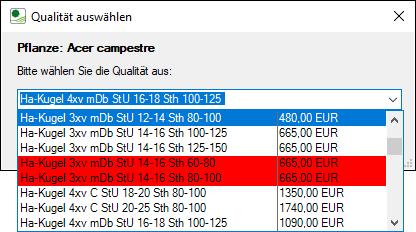 Auch bei Verwendung des neuesten Artikelstamms können alte, nicht mehr vorhandene Pflanzen über die Positionsliste der Pflanzplanung selektiert und angewendet werden. Die Auswahl einer anderen Qualität ist dann aber nicht mehr möglich. Natürlich können die Pflanzen auch über den normalen Kopieren-Befehl vervielfältigt werden.