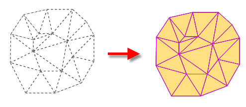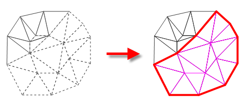 Dreiecksnetze aus 3D-Flächen sind i. d. R. ein Resultat eines Digitalen Geländemodells oder sonstiger Vermaschungen z. B. aus dem Modul Landcad. Kennzeichnend ist hierbei, dass die Dreiecksseiten benachbarter Dreiecke jeweils aus zwei 3D-Flächen bestehen, d. h. die Kanten kommen doppelt vor.