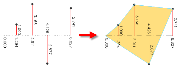 Mit Hilfe zweier Schalter haben Sie die Möglichkeit, den Anfangspunkt (Nullpunkt) und/oder den Endpunkt der Abszisse in die Konturberechnung mit einzubeziehen. Dies ist sehr oft der Fall, wenn die Messachse vollständig innerhalb der aufgemessenen Fläche liegt. Ist die vom Programm vorgeschlagene Kontur korrekt, können Sie zur Berechnung übergehen, ansonsten ist eine separat erstellte Konturlinie auszuwählen.