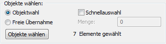 Freie Übernahme – Diese Option dient zur freien Übernahme einer beliebigen Position, welche nicht in der Zeichnung referenziert ist. Dies können Positionen sein, die weder berechnet noch gezählt werden können (z.B. Pauschalpositionen) oder aber Positionen, deren rechnerischer Nachweis an anderer Stelle geführt wird, so z.B. Erdmassenberechnungen o.ä. Aus diesem Grund wird die Objektwahl automatisch deaktiviert und es stehen nur noch die Eingabefelder für die Menge und die Einheit zur Verfügung. Die Einheit wird automatisch einer gewählten Position entnommen, die Menge kann frei eingetragen werden.