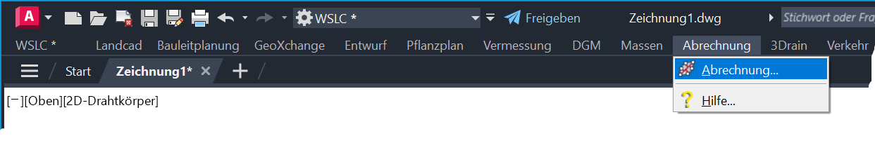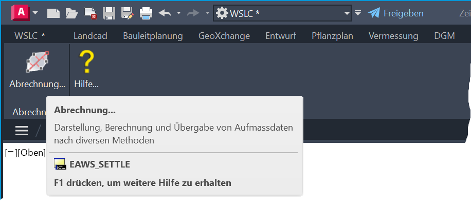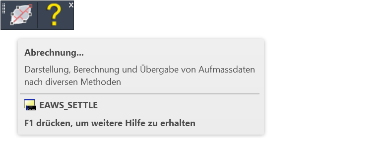 Zur Befehlsauswahl stehen je nach verwendetem CAD-System und verwendeter Konfiguration ein Register in der Multifunktionsleiste, ein Pull-down-Menü und ein Werkzeugkasten zur Verfügung, welche jeweils die gleiche Befehlsstruktur aufweisen. In diesem Modul steht lediglich der Befehl Abrechnung (EAWS_SETTLE) zur Verfügung, welcher den Hauptdialog mit der gesamten Funktionalität beinhaltet.