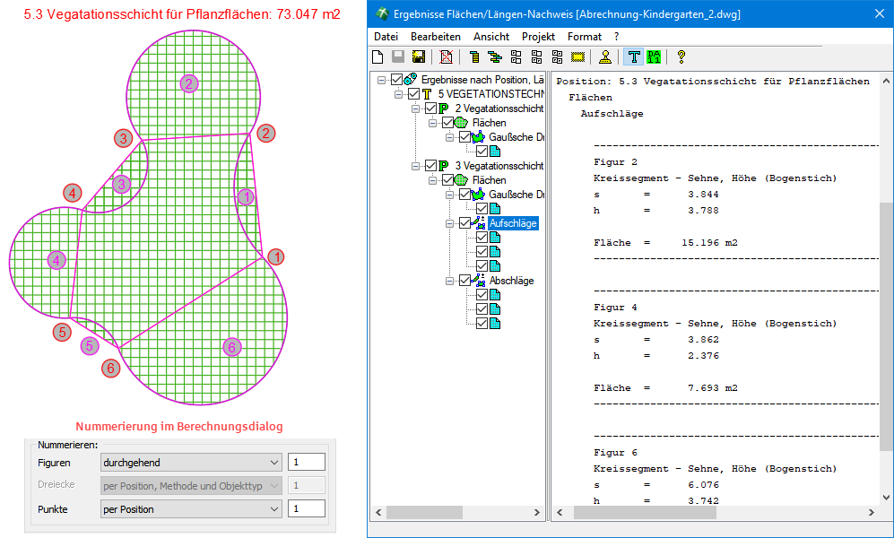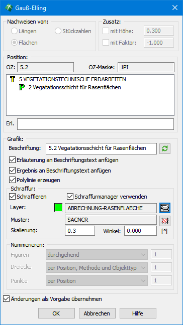 Dies bedeutet, dass Sie nun entweder die Objektwahl erneuern, die Einstellungen für diese Position vornehmen (Layer, Texthöhe, Polylinie erzeugen) oder direkt zur Berechnung übergehen können. Stellen Sie also spätestens jetzt den Layer und die Texthöhe im mittleren  Dialogteil ein und überprüfen Sie die Angaben zur Position.