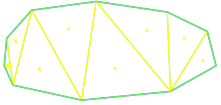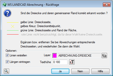 Nach der Objektwahl oder der Wahl eines TINs erscheint ein spezieller Rückfragedialog, während die von der Abrechnung ermittelte Dreiecksbildung temporär am Bildschirm wie folgt dargestellt wird: