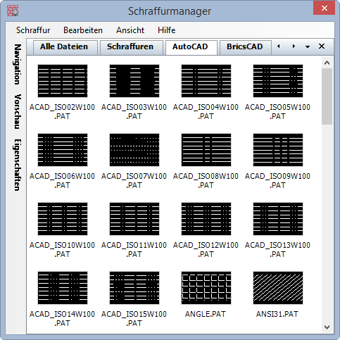Die Schraffurmusterauswahl kann wahlweise über eine Schnittstelle zum Schraffurmanager oder über den Standard-Dateidialog vorgenommen werden.