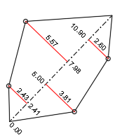 In der Zeichnung können Dreiecke aus Linien oder 3D-Flächen verwendet werden. Linien können manuell, ausgehend von einer Basislinie durch fortlaufende Dreiecksmessungen mit dem Absteckplan erzeugt werden. Dadurch sind die Elemente bereits vermaßt. Es können jedoch auch fertige Dreiecke aus beliebigen Linien oder 3D-Flächen aus dem WS LANDCAD-DGM sowie Triangulationen aus Civil 3D direkt verwendet werden. |