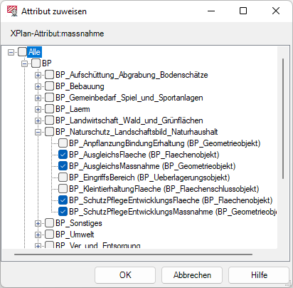 Vor allen Klassen und gruppierten Oberpunkten kann per Checkbox eine Auswahl getroffen werden. Mit OK erfolgt ein Zuweisen auf die selektierten Objektklassen, Abbrechen verhindert sie.