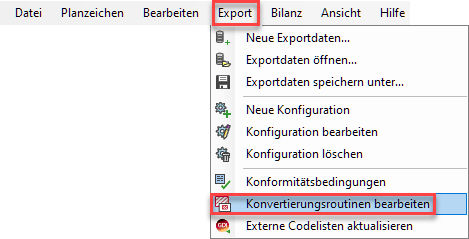 Anmerkung: Der Menüpunkt Export und die damit verbundenen Befehle und zusätzlich zugängliche Fenster sind nur im Expertenmodus des Planzeichenmanagers verfügbar, welcher im Menüpunkt Bearbeiten aktiviert werden kann. |
