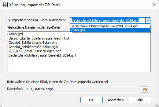 Befinden sich im Zip-Archiv mehrere GML-Dateien, muss die gewünschte GML-Datei gewählt werden. In der Zeile Zu importierende GML-Datei auswählen steht per Klappliste eine Auswahlmöglichkeit bereit. Da das Archiv durch den Importvorgang entpackt werden muss, ist unter Dateipfad das Verzeichnis dafür bestimmbar. Mit OK wird der Import gestartet.