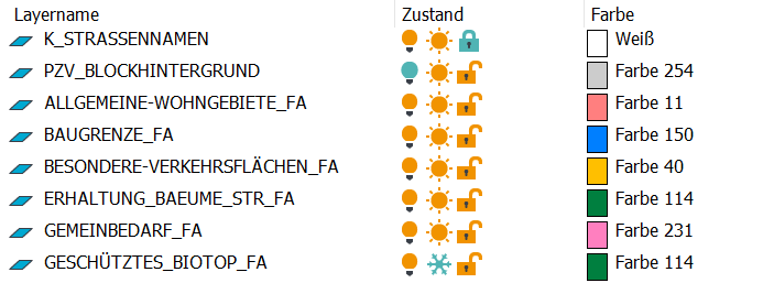 Bei aktivierter Layer-Reihenfolge werden stets alle verwendeten Layer der Zeichnung angezeigt. Nicht verwendete Layer sind für eine Layer-Reihenfolge irrelevant und finden daher hier keine Beachtung. In der dazugehörigen Klappliste befinden sich alle benannten Reihenfolgen, wobei die Reihenfolge "VonFilter [<Unbenannt>]" den Grundzustand bezeichnet. Es handelt sich hierbei um die automatisch erstellte Layer-Reihenfolge der Filter-Reihenfolge "<Unbenannt>". Auch für andere benannte Filter-Reihenfolgen werden solche dynamischen Layerreihenfolgen automatisch erstellt. Sie besitzen die Eigenschaft "VonFilter", was bedeutet, dass die Reihenfolge der Layer, der Reihenfolge der Filter und ihren enthaltenen Layern entspricht. Die Layer werden mit ihren Layernamen, dem Zustand (Ein, Frieren, Sperren) und der Farbe dargestellt.