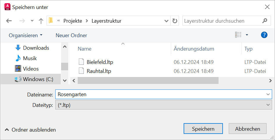 Nach der Bestätigung mit OK erscheint die Aufforderung zum Speichern der Layer-Struktur-Datei, gefolgt von einer entsprechenden Meldung. |