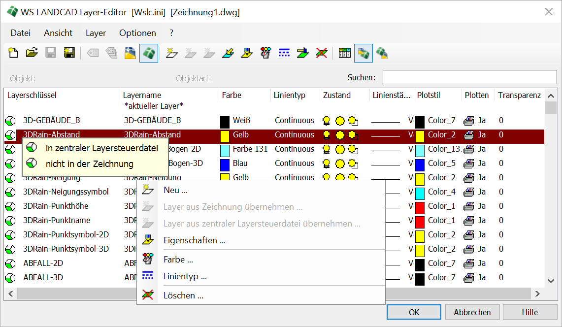 WS LANDCAD besitzt eine zentrale, benutzerabhängige Layersteuerung, welche die Eigenschaften aller von WS LANDCAD erzeugten Layer regelt. Die zentrale Layersteuerung wird durch die Schaltfläche LAYER in den jeweiligen Dialogboxen einer WS LANDCAD-Funktion automatisch aktiviert, ist aber auch unabhängig davon durch Betätigung des Befehls Layer → Layersteuerung aufrufbar.