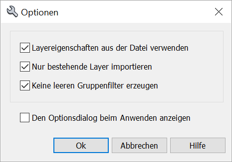 Die zur Verfügung stehenden Optionen regeln die Verarbeitung importierter Layerfilter in der Zeichnung. Zusätzlich lässt sich der Optionsdialog bei jedem Anwenden anzeigen, um die Optionen individuell für die jeweilige Zeichnung einzustellen. Folgende Optionen stehen zur Verfügung: |
