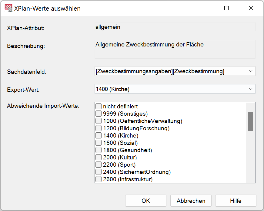 Die Import- und Exportkonfiguration braucht im einfachsten Fall nur auf einen Attributnamen der XPlanung zurückzugreifen, in welches die Sachdaten von WS LANDCAD eins zu eins übergeben werden. Die GRZ ist ein solch einfacher Fall. Komplizierter sind Fälle, bei denen neben der Kommunikation der Sachdatennamen auch eine Übersetzung von WS LANDCAD Schreibweisen (z. B. Kirchliche Zwecke) in XPlan-Enumerationen (z. B. 1400 statt Kirchliche Zwecke) erfolgen muss. Vollends ausgereift muss die Konfiguration für andere Importvorgänge sein können: Es kann vorkommen, dass für den Import keine eins zu eins Übersetzung ausreicht, sondern, dass nur eine Auswahl an Enumerationswerten auf ein Planzeichen in WS LANDCAD umgeleitet werden muss. Die Übersetzung der XPlan-Attribute und -Werte in WS LANDCAD-Informationen geschieht über die Dialogbox XPlan-Werte auswählen.