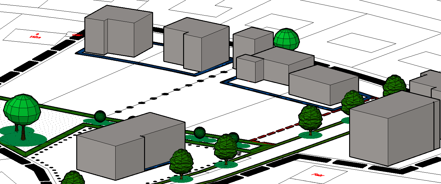 Im Resultat sind gut die unterschiedlich hohen Quader zu erkennen. Die Bauflächen, auf denen sie platziert sind, übertrugen aufgrund differierender Geschossinformationen unterschiedliche Extrusionshöhen. Anzupflanzende und zu erhaltene Bäume weisen unterschiedliche Farben und Strukturen auf. Das ist aufgrund der Maßnahmenfestsetzungen und den daraus variierenden Blocknamen möglich. Unter den 3D-Bäumen erscheinen weiterhin die 2D-Planzeichensymbole. Sie bleiben genauso wie die Polylinien der Gebäudeumrisse aus dem Kataster erhalten.