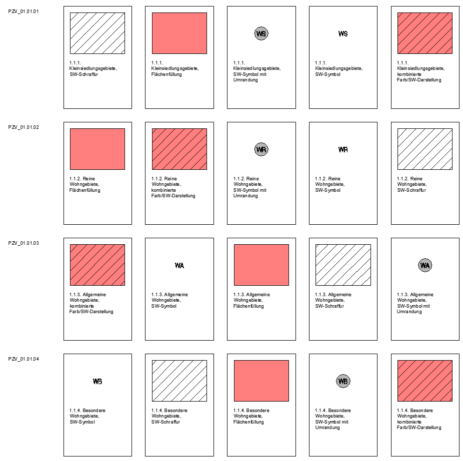 Die Planzeichen werden nach dem vorhandenen Planzeichenschlüssel sortiert und mit einem Rahmen versehen. Die Planzeichenschlüssel werden zeilenweise untereinander aufgeführt und enthalten alle Planzeichen, die diesen Schlüssel verwenden, in einer waagerechten Anordnung.