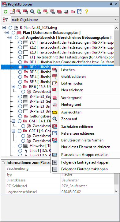 Der Projektbrowser ist das Verwaltungswerkzeug der Planzeichenverordnung. Es listet alle Planzeichen einer Zeichnung auf und verwaltet diese über angelegte Pläne und Bereiche.