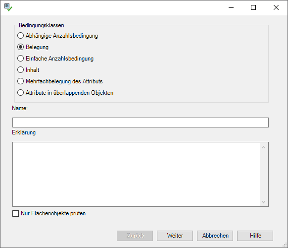 Durch die Checkbox Nur Flächenobjekte prüfen kann die Konformitätsbedingung auf XPlan-Objekte eingeschränkt werden, die eine Flächengeometrie besitzen. Bei Punkt-, und Liniengeometrien gilt diese Bedingung dann automatisch als bestanden.